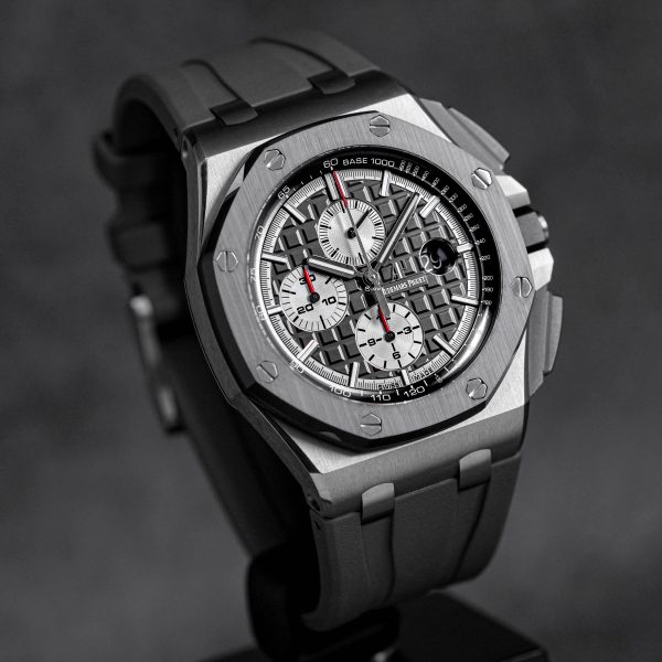 The Audemars Piguet Royal Oak Offshore Chronograph features a titanium case, a black ceramic bezel, and a grey dial. This wristwatch is designed to last with its box and papers with production year of 2018. A classic piece for any men’s wardrobe.